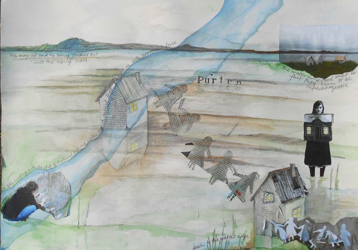 Tidal-Village-painting-as-documentation-1 Published November 17, 2017 at 1200 × 840 in “Tidal Village” by Luci Gorell Barnes; Purton; Mid-Severn Estuary – high tide; 23 09 2017