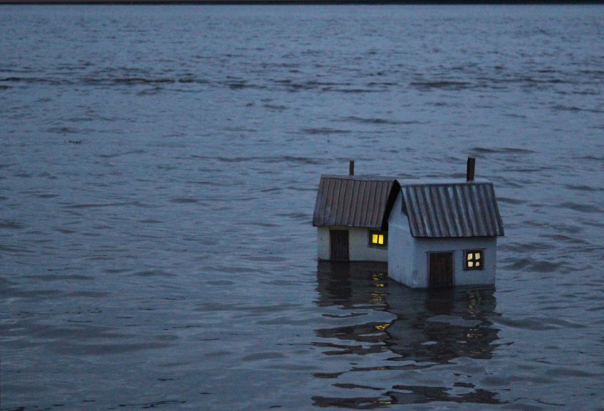 2 night houses Published June 18, 2018 at 4609 × 3143 in Tidal Village (night); Severn Estuary; By artist Luci Gorell Barnes.