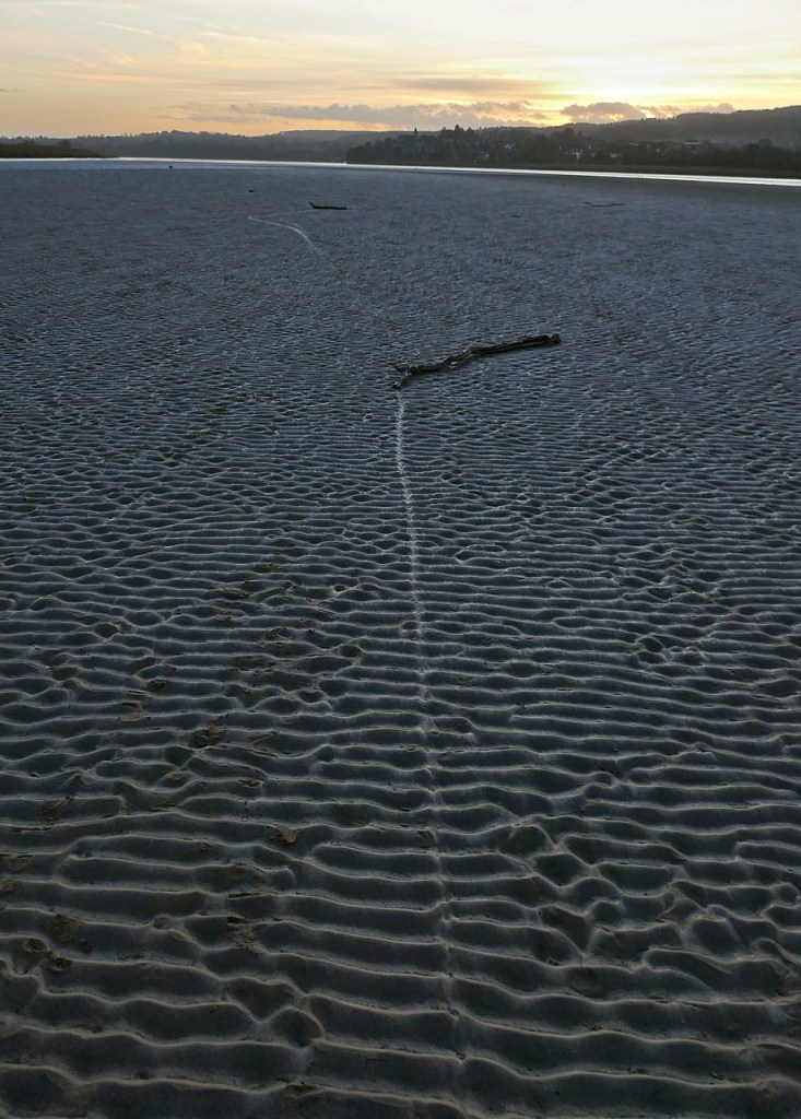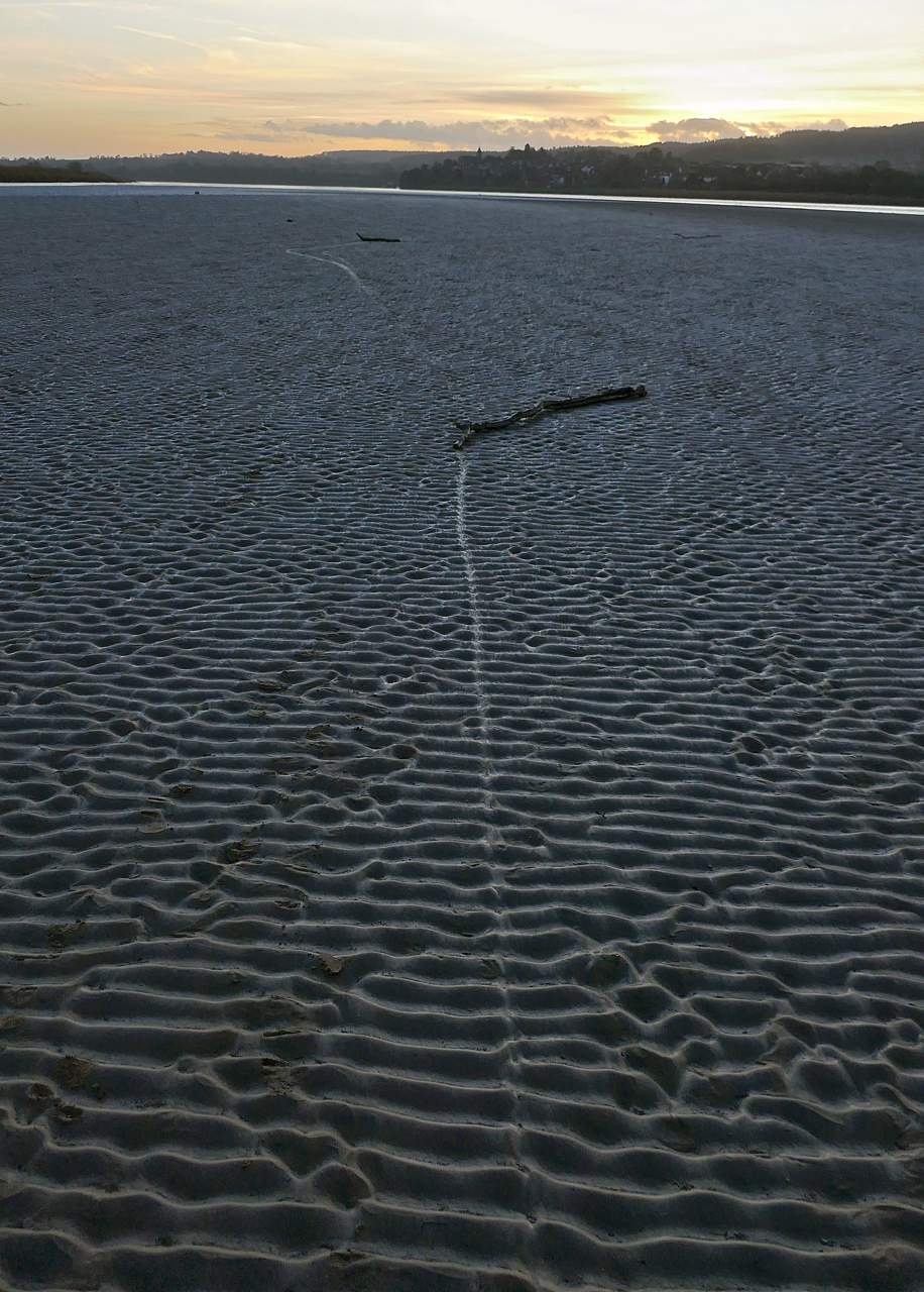 P1010336 Published February 5, 2020 at 916 × 1280 in Treece – a mark left on intertidal ground by bits of wood and other objects, as they are dragged, and then left stranded, by the last ebbings of a falling tide.