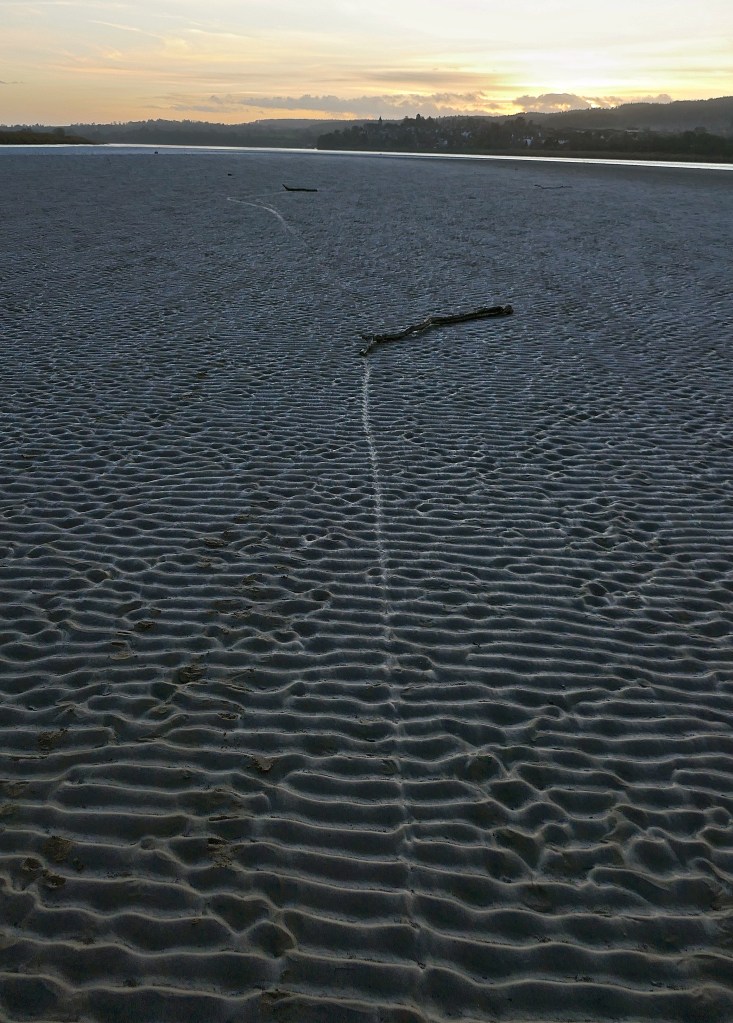 P1010336 Published January 12, 2020 at 3048 × 4258 in Treece – a mark left on intertidal ground by bits of wood and other objects, as they are dragged, and then left stranded, by the last ebbings of a falling tide.