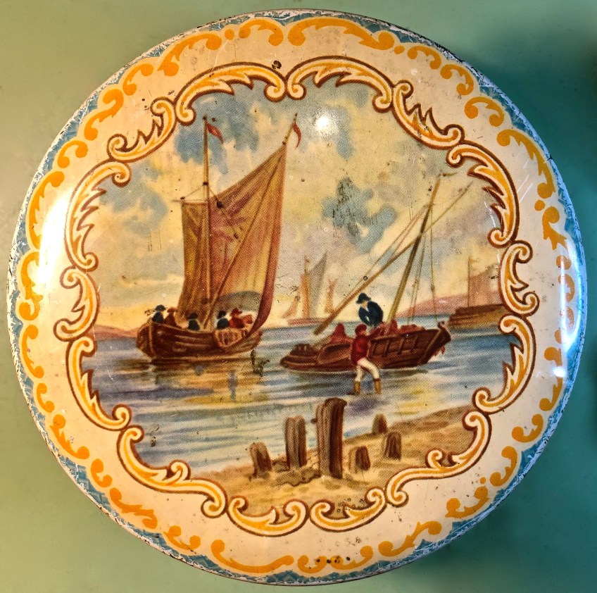 IMG_1986 Published January 20, 2020 at 2479 × 2464 in Vintage, pretty, ‘ebb tide’, Huntley and Palmer buscuit tin showing sailing scenes.
