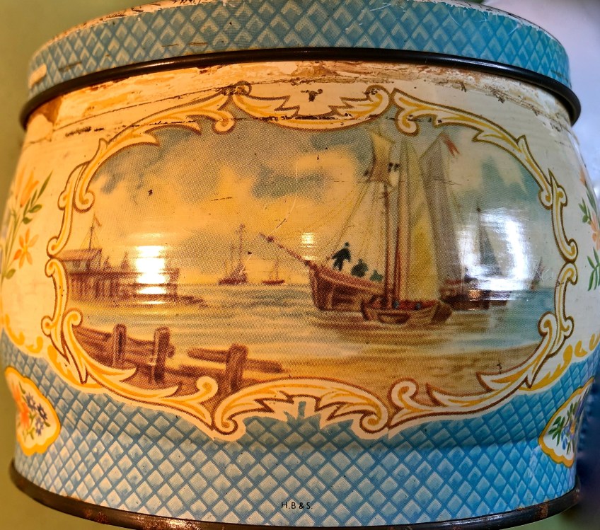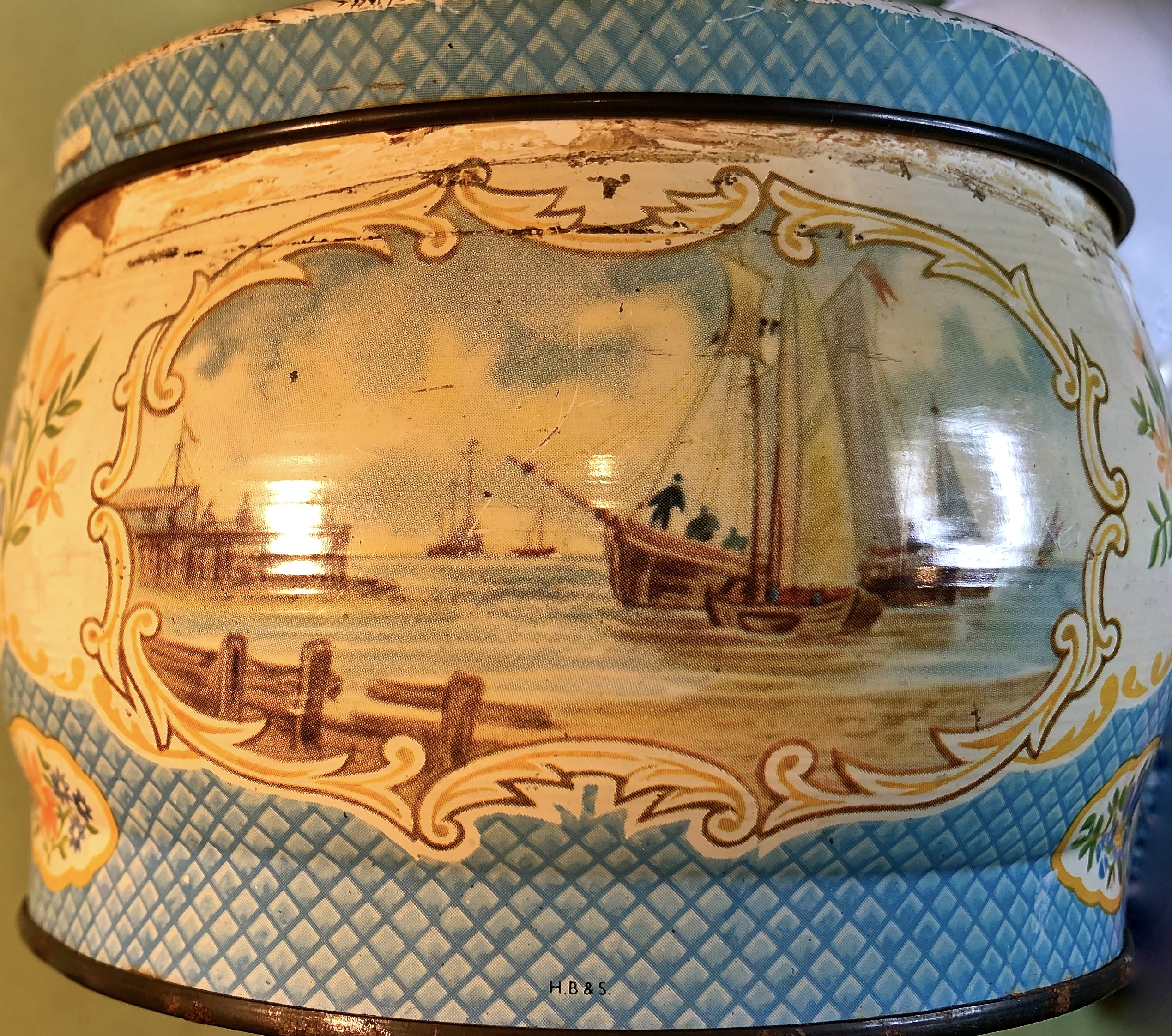 IMG_1987 Published January 20, 2020 at 2538 × 2243 in Vintage, pretty, ‘ebb tide’, Huntley and Palmer buscuit tin showing sailing scenes.