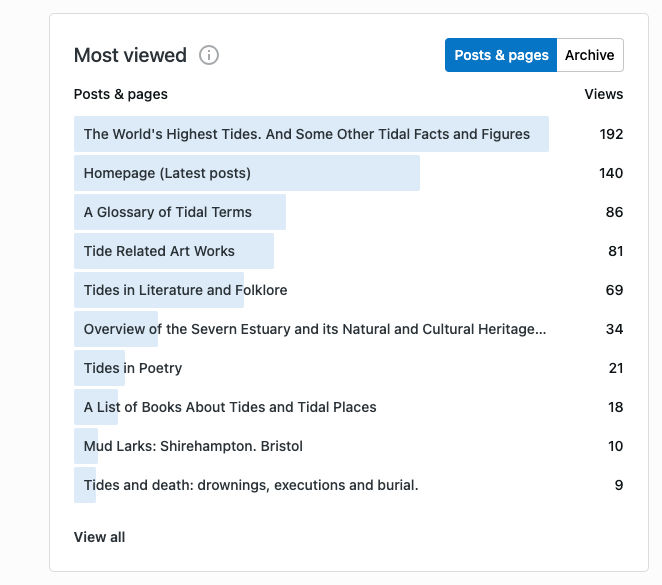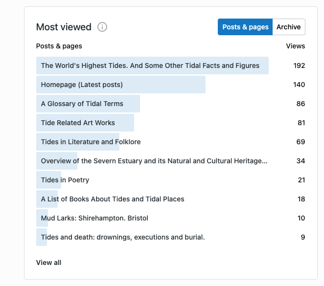 Recent WordPress Stats fot this Tidal Cultures Blog. Posted on April 11, 2026 by Owain Jones Reply Thanks to everyone from around the world for checking in! These are screen grabs! Click on them to enlarge.