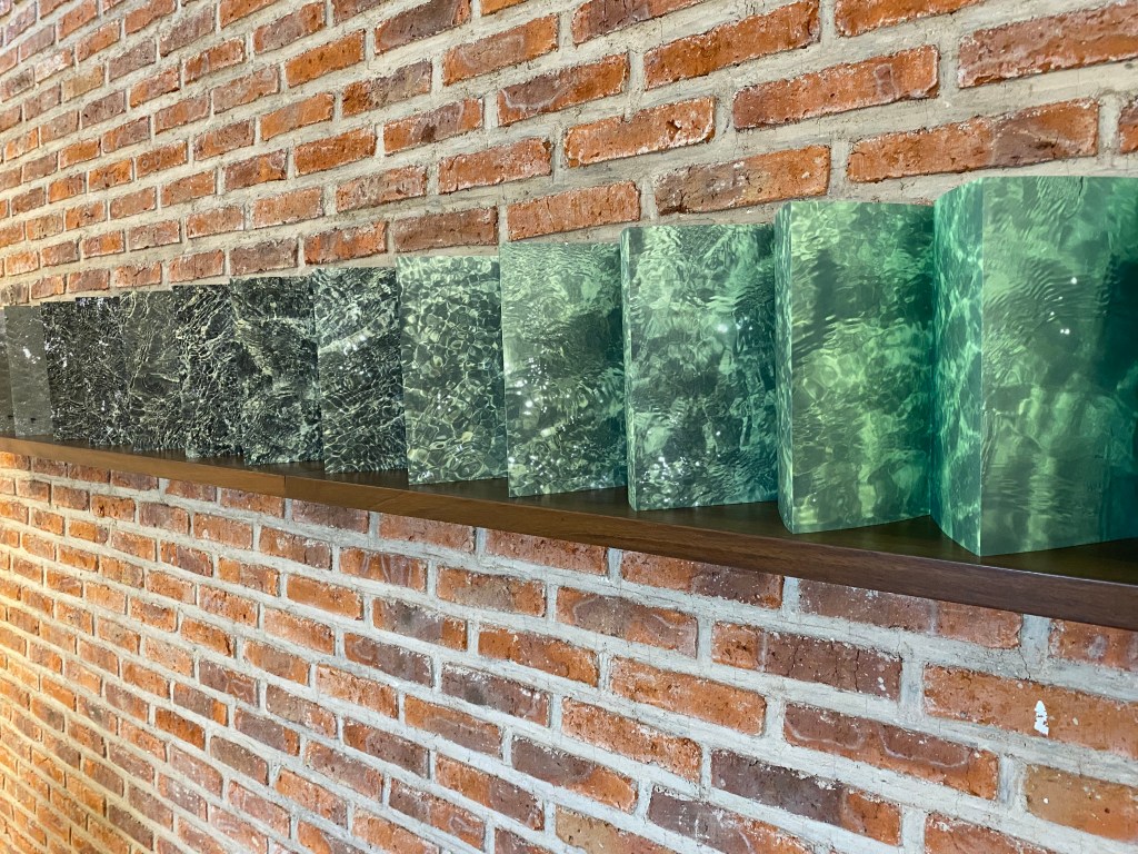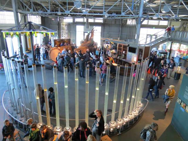 “Using live data from the NOAA tide station near the Golden Gate Bridge, the twenty-four soaring columns in this exhibit display San Francisco Bay tide heights for the current day. As each hour ends, another column is locked off, preserving the tide height for that particular hour. Visitors can see the rising and falling tidal pattern—and contemplate the significance of the tides.