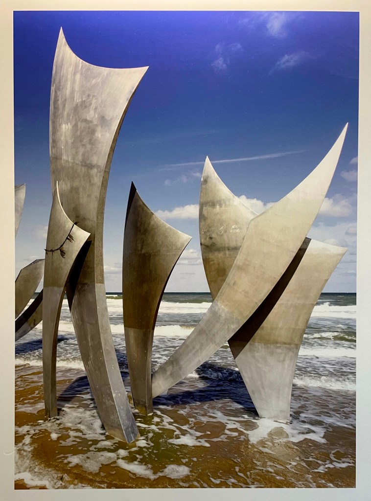 In the inter-tidal zone on Omaha Beach in Saint-Laurent Sur Mer, in the Normandy region of France. It’s called Les Braves. It was erected in 2004 as a commemoration to the American soldiers who died during the D-Day Invasion in June of 1944.