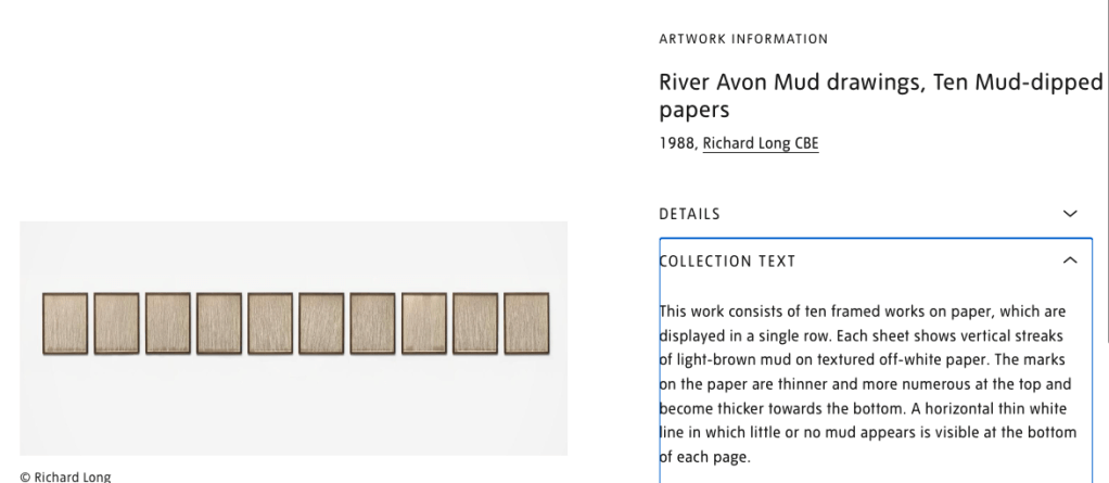 “My first natural playground was the cliffs of the Avon Gorge and the towpath by the river. So even as a kid I was fascinated by the enormous tide, and the mud banks, and the wash of the boats as they swept past. You have this wash sweeping up the mud … muddy creeks … I guess it’s right to say that I have used that experience in my art: like water, the tides, the mud. All that cosmic energy is there in my work.” Richard Long.