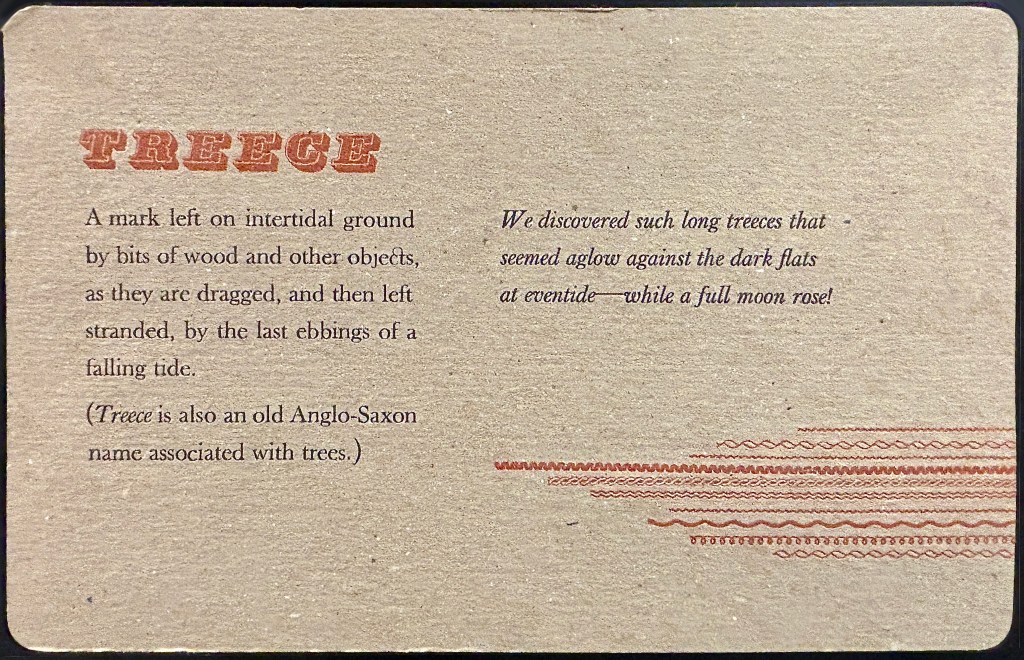 Treece is a newly coined word for a mark made on intertidal land by objects as the tidal water ebbs away. This was coined by Heather Green and Owain Jones when exploring the upper Severn Estuary. A large number of such marks happened to be visible. Card made by Heather Green.